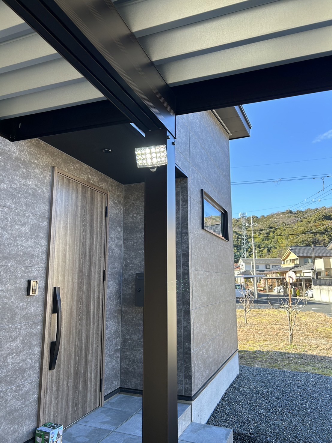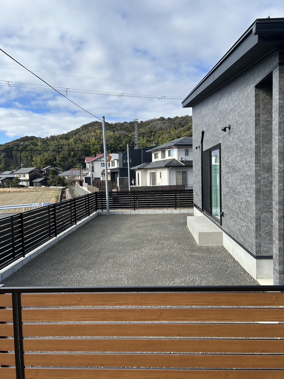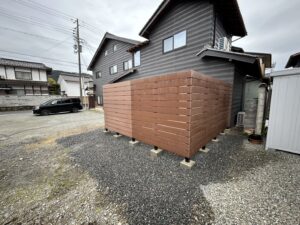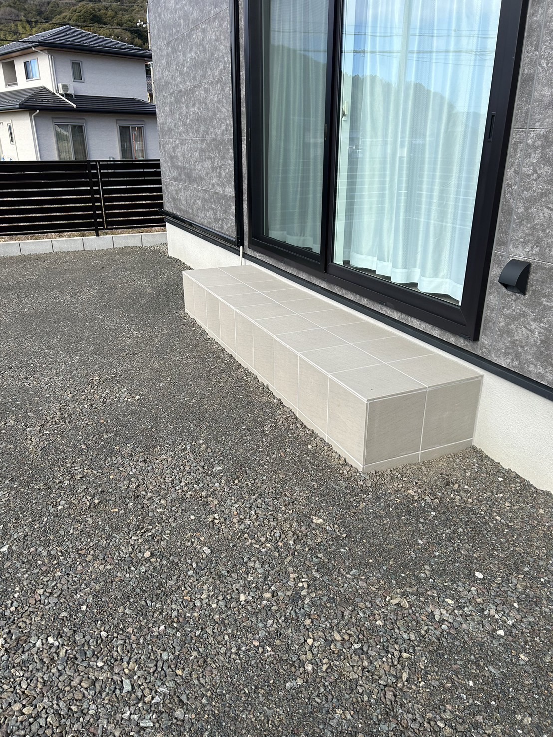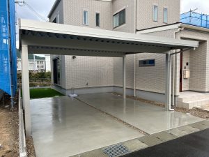 今回は、カーポート2台用、モクアルフェンスを設置致し、タイルテラスを作りました。とてもシンプルな外構デザインで、スッキリと仕上がっています。
